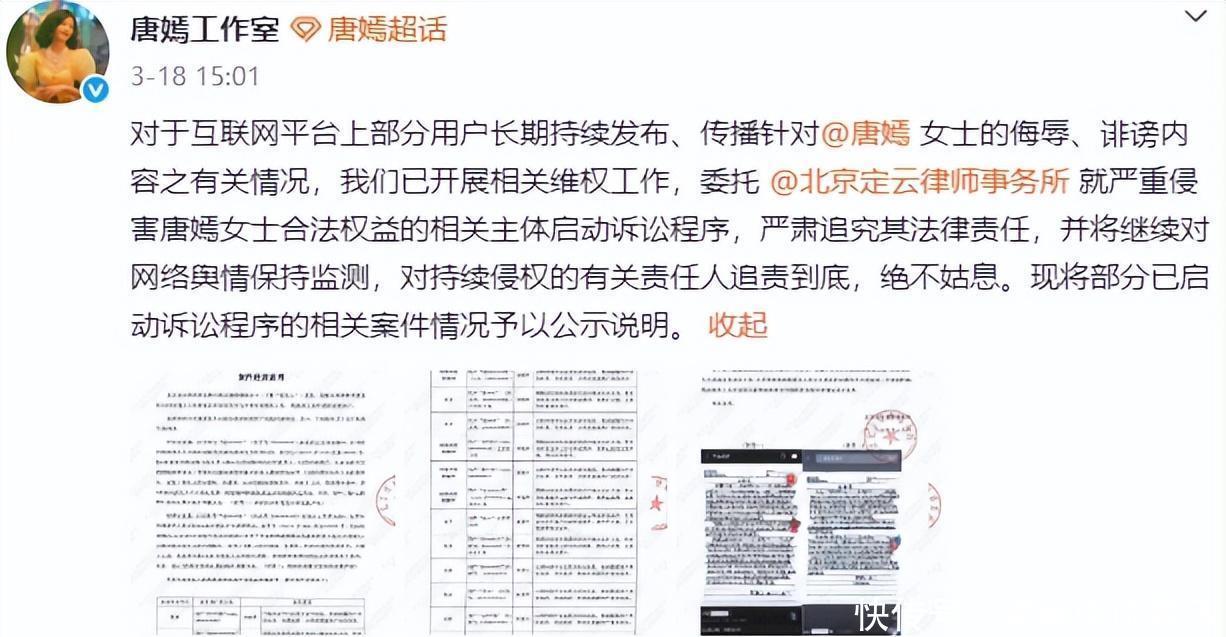 只不过唐嫣的工作室在3月18号的时候发了一条动态,针对于网络上那些散播谣言的社交帐号进行了起诉。