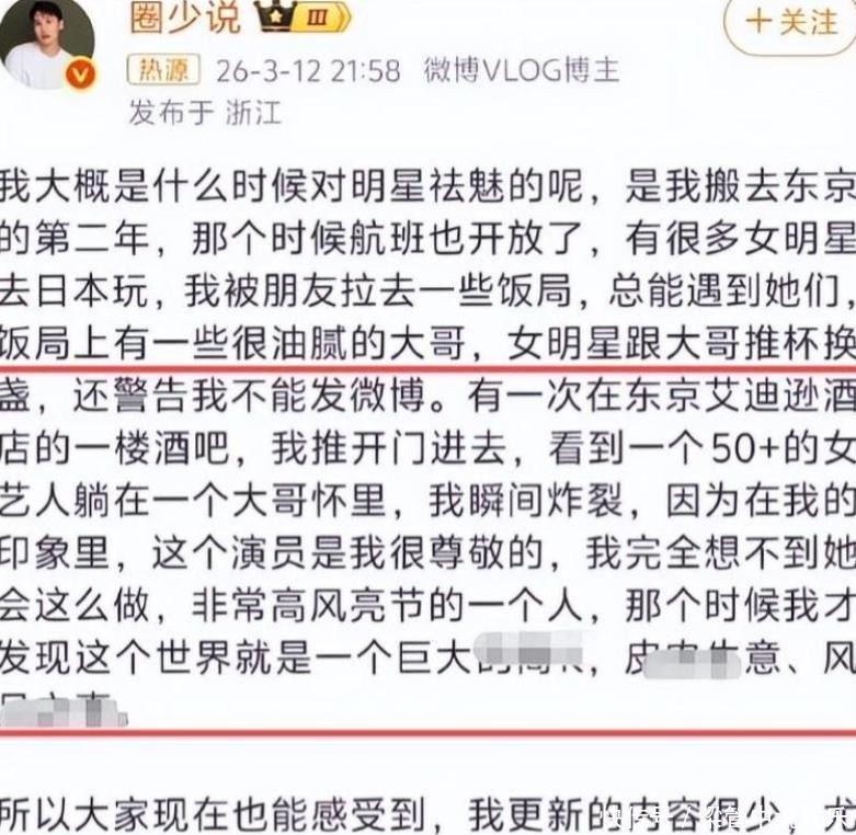 从他的动态中可以得知,他原本对娱乐圈的明星是比较尊敬的,但是有一次他看到一位年过半百的女星躺在某大哥怀里。