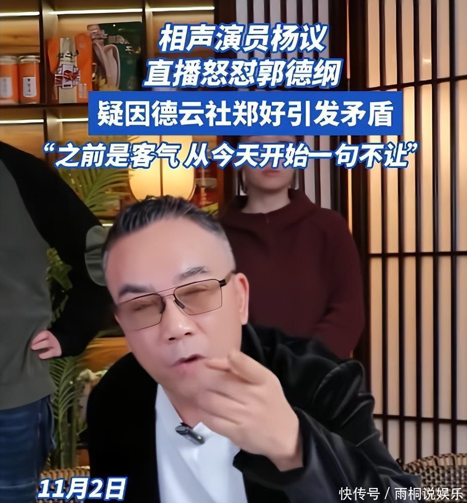 2021年,德云社演员郑好直播批评杨议,杨议要求郭德纲管教徒弟未获回应。 2025年杨少华去世后,郭德纲未出席葬礼,网上流传出被解读为暗讽的视频。 自此,杨议开始了在直播间对郭德纲持续不断的公开批评,从艺术风格到个人品行。