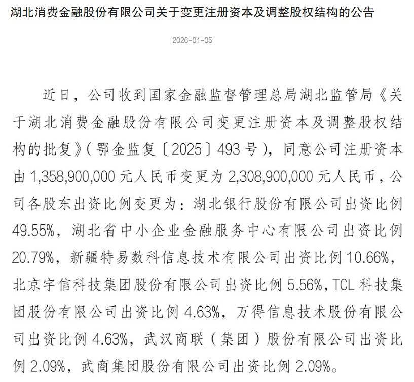 1月5日,湖北消费金融股份有限公司发布关于变更注册资本及调整股权结构的公告。国家金融监督管理总局湖北监管局批复,同意湖北消费金融股份有限公司的注册资本由13.589亿元变更为23.089亿元。