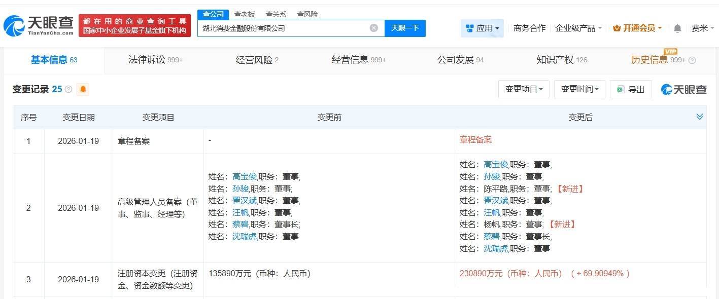 【大河财立方消息】天眼查工商信息显示,近日,湖北消费金融股份有限公司发生工商变更,注册资本由约13.6亿人民币增至约23.1亿人民币,增幅约70%,同时,部分主要人员发生变更。