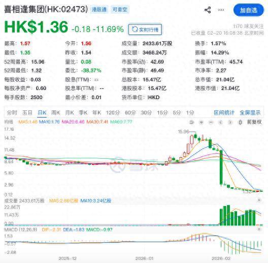 截至2月20日收盘,喜相逢集团收跌11.69%报1.360港元,这与其在1月22日创下的15.96港元阶段性高点相比,累计跌幅约九成,总市值仅剩21亿港元。