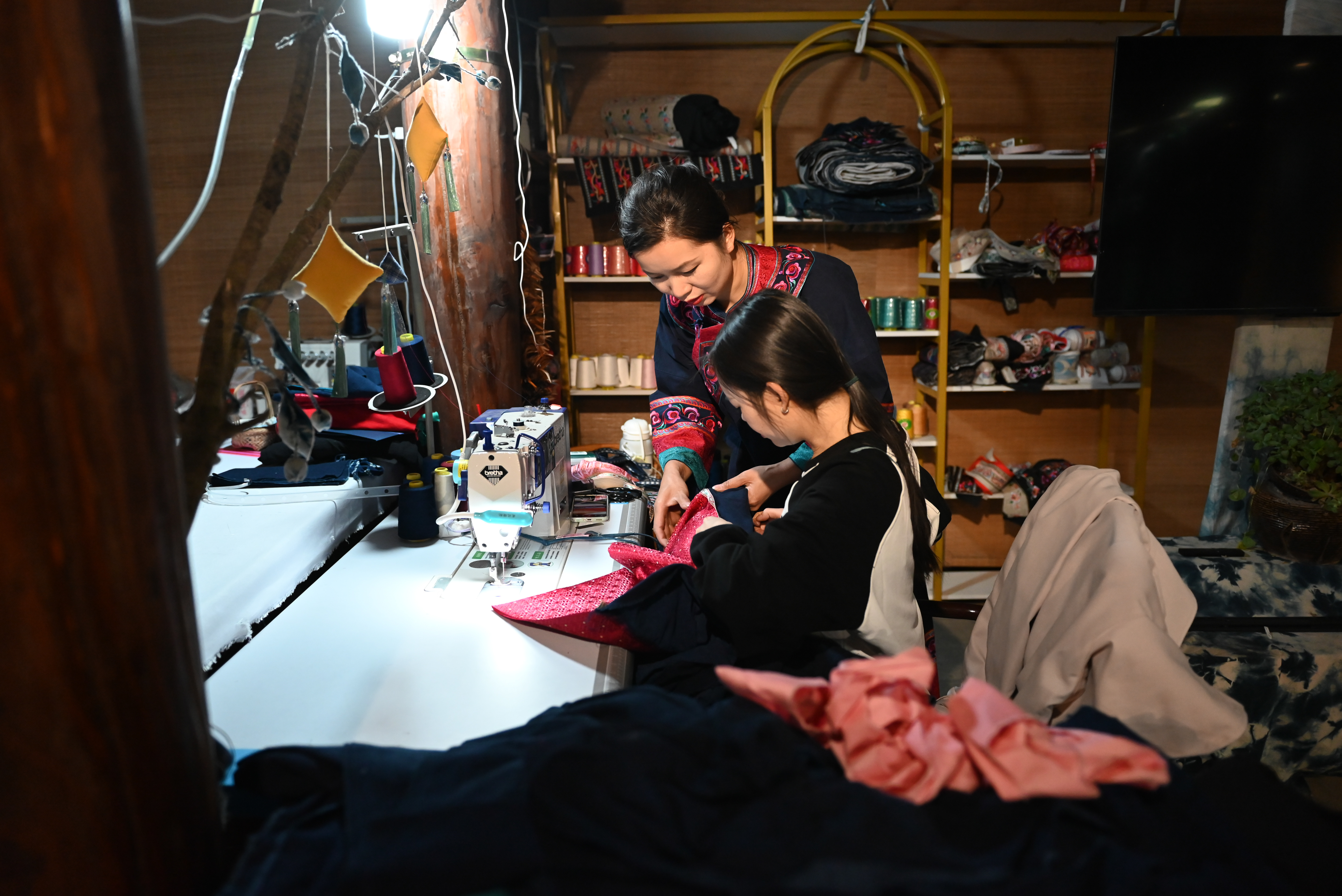 李利(后)在贵州省兴义市万峰林景区门店内与员工一起制作民族服饰(2024年2月19日摄)。新华社记者 刘续 摄