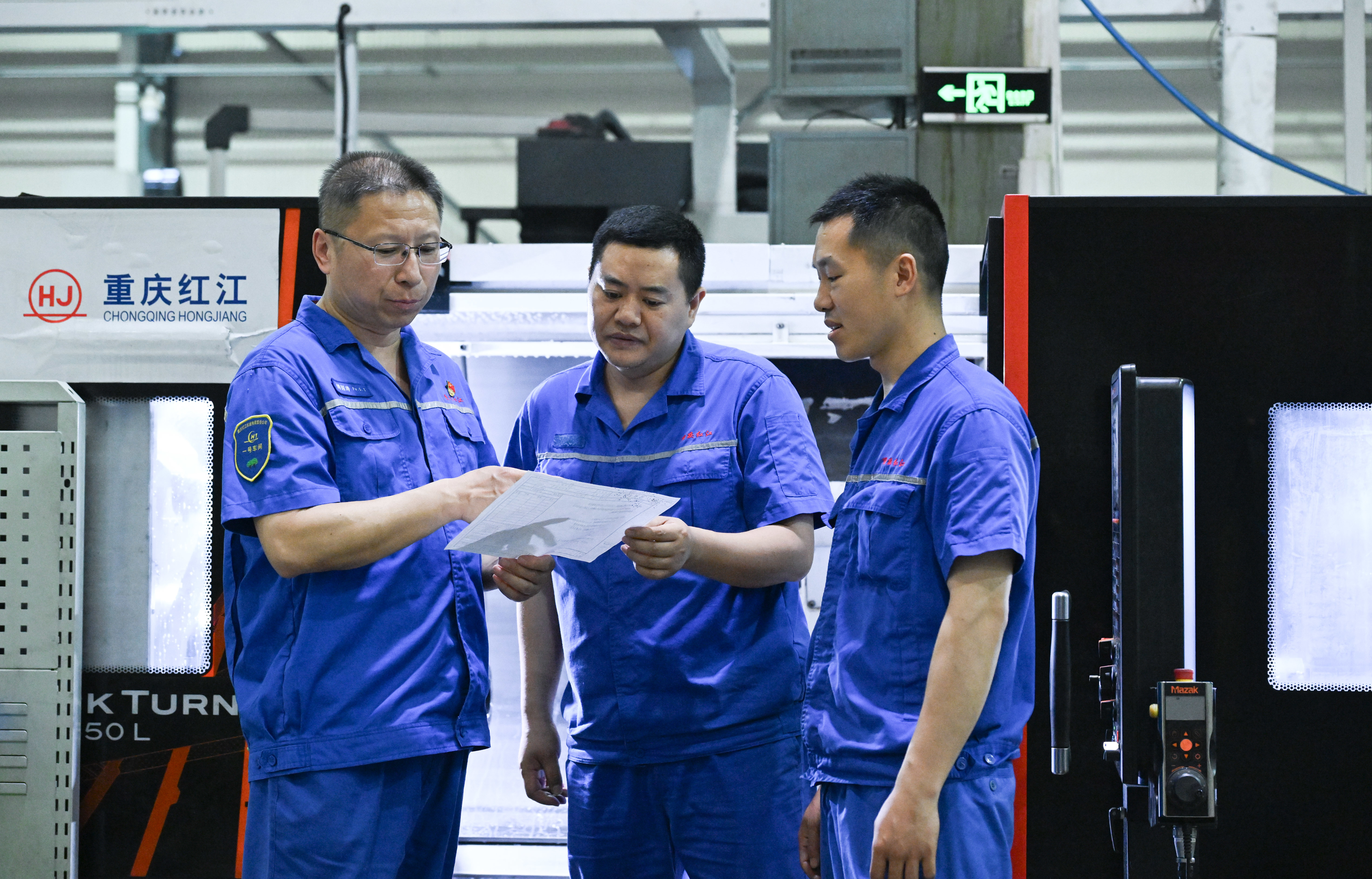 2025年5月23日,傅国涛(左一)在重庆红江机械有限责任公司生产车间与同事交流。新华社记者 王全超 摄